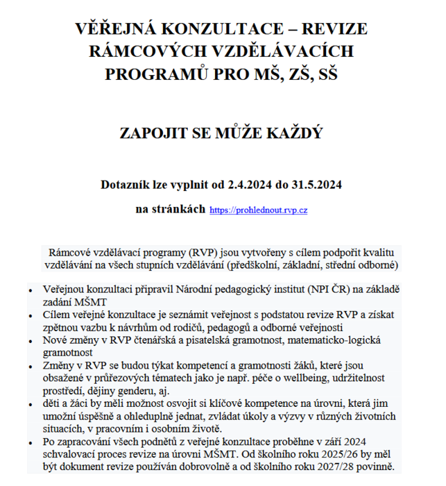 NPI (Národní pedagogický institut) a MŠMT spustilo dotazník na revizi rámcových vzdělávacích programů pro mateřské, základní a střední školy. Odkaz zde: