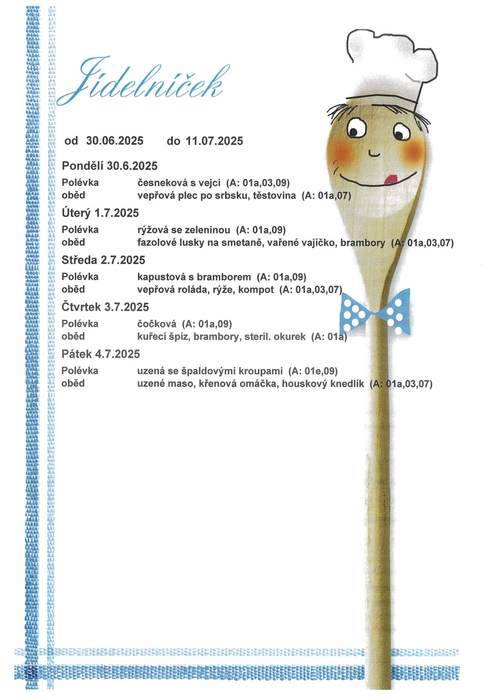 Úvod > Život v obci > Jídelní lístek MŠ > Jídelníček 30.6. - 11.7.2025